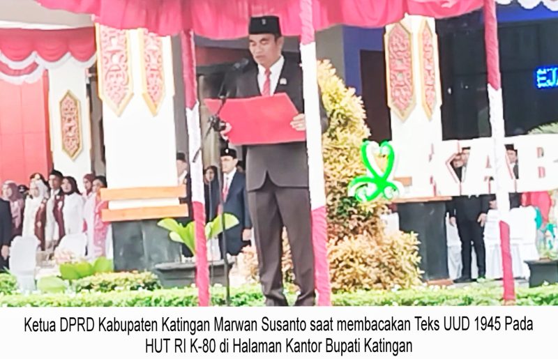 KATINGAN – Ketua Dewan Perwakilan Rakyat Daerah (DPRD) Kabupaten Katingan Marwan Susanto membacakan teks Undang-Undang Dasar Negara Republik Indonesia tahun 1945 pada puncak HUT RI ke-80 yang berlangsung di halaman kantor bupati Katingan.